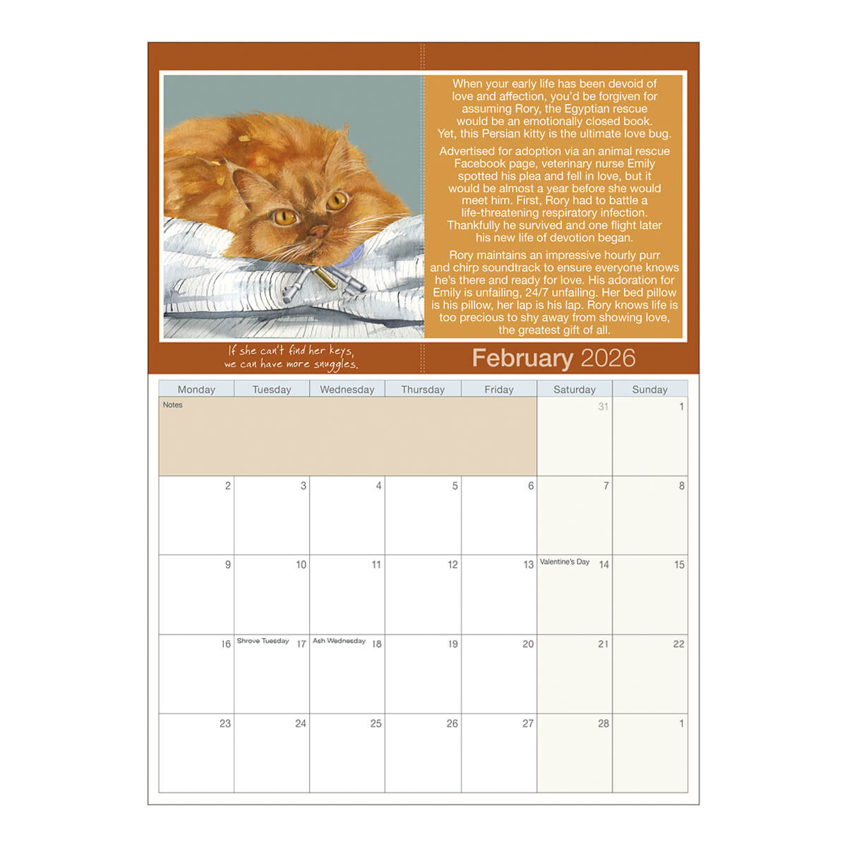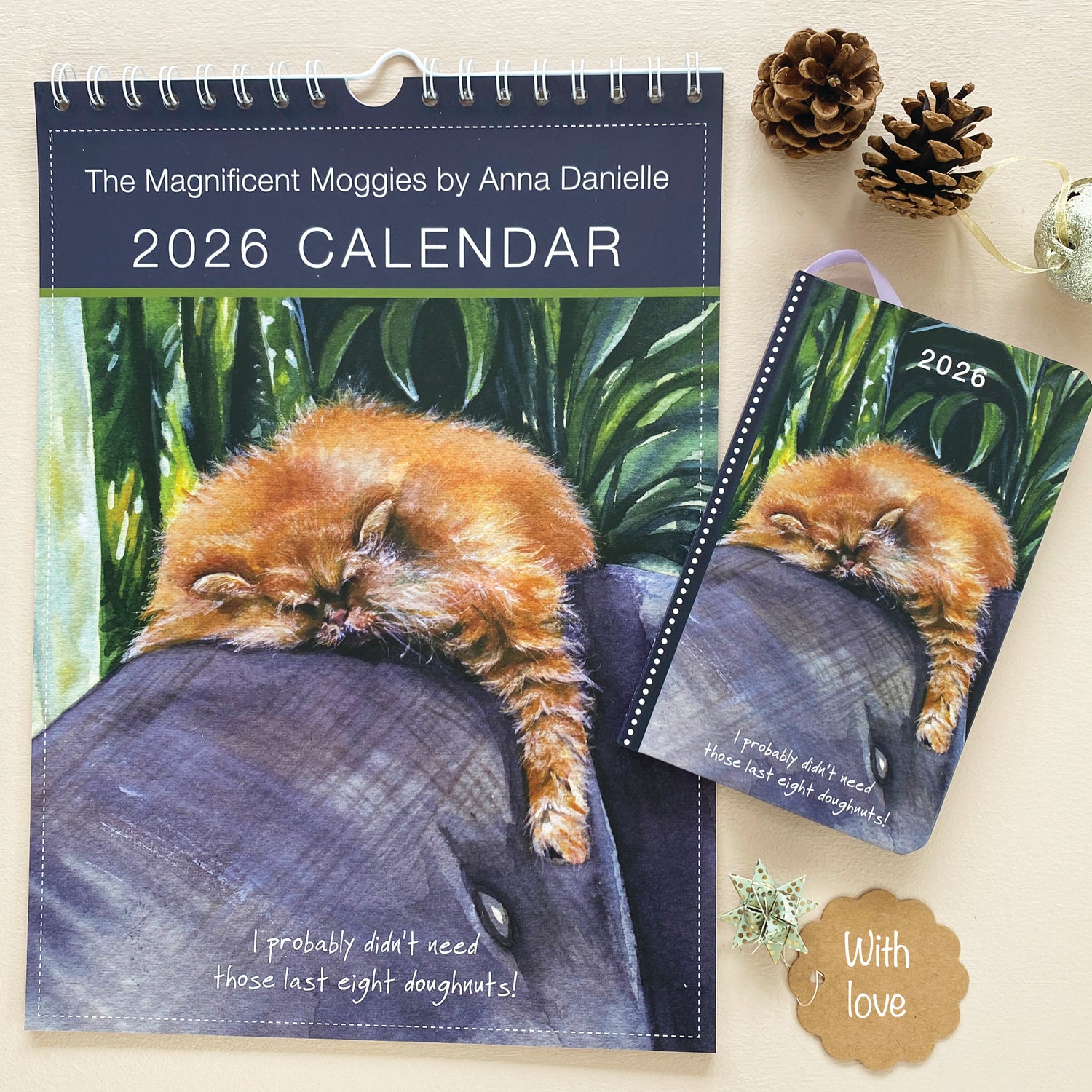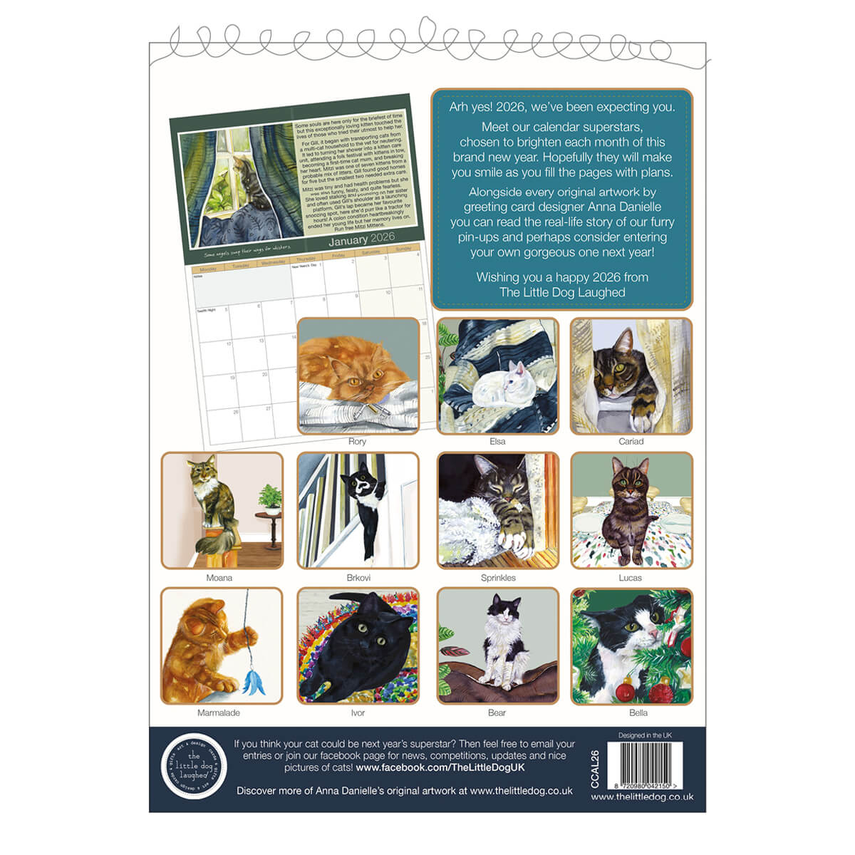 Here it is! Your 2026 Magnificent Moggies’ Calendar. Featuring twelve legendary feline superstars. Every month stars a moggie chosen from hundreds of photo entries submitted to this year’s Search for a Superstar competition. On each month you can delight in the original artwork illustration by Anna Danielle and know that somewhere in the world there is a furry feline wishing this calendar winner thing was a warm duvet or a mouse!